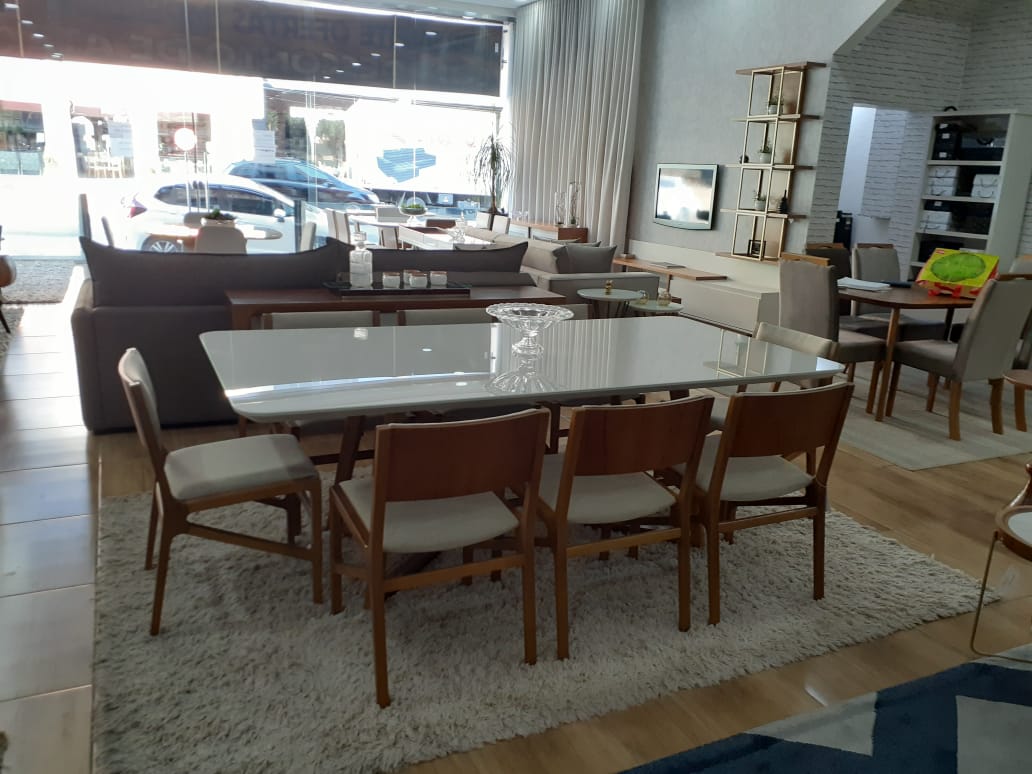 Mesa para sala de jantar, com cadeiras super estilosas e uma mesa moderna com revestimento amaderado.